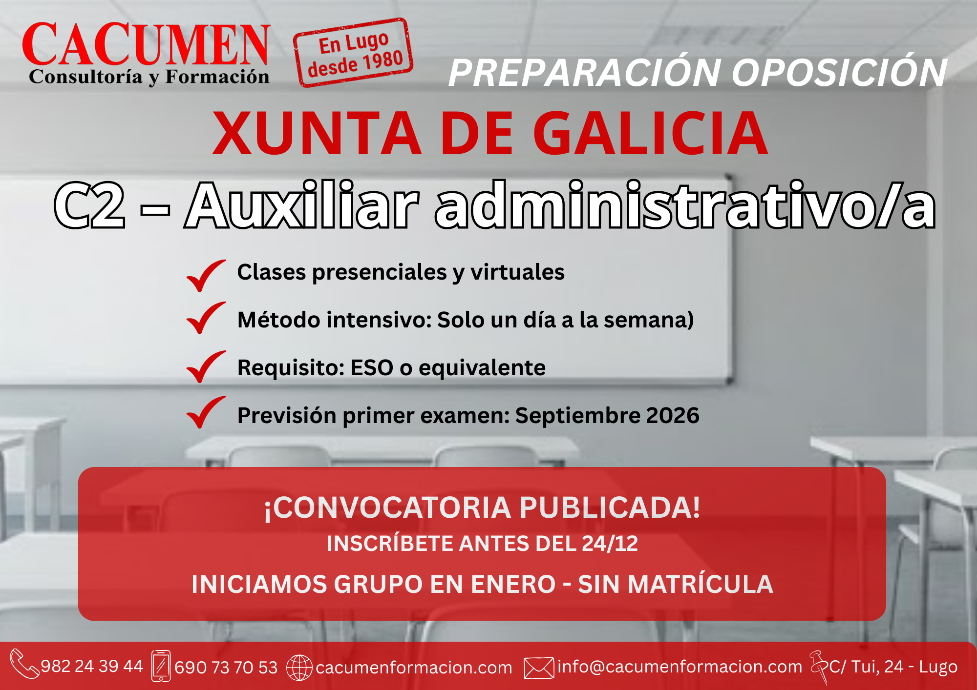 En CaCumen Formación llevamos preparando opositores desde 1980 y sabemos que ahora surgen muchas dudas. No te quedes con ellas: contáctanos para recibir la mejor orientación experta y afrontar este reto con garantías. ¡Tu plaza te espera!